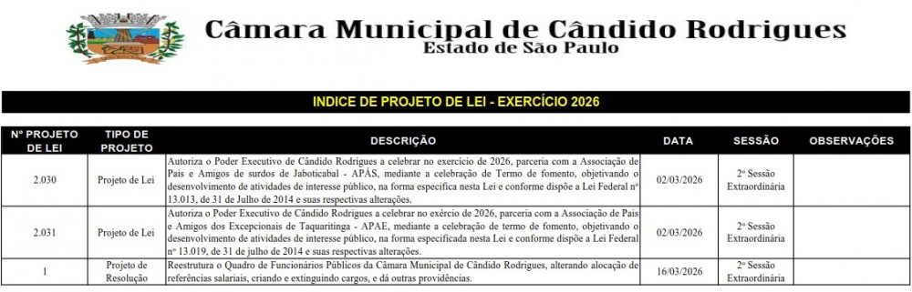 A Câmara Municipal de Cândido Rodrigues realizará, na próxima sexta-feira, dia 20 de Março de 2026, às 17:10h, a 2ª Sessão Extraordinária do ano legislativo. A reunião será realizada no plenário da Casa e contará com a apresentação e deliberação de importantes projetos de lei voltados ao planejamento orçamentário e à estrutura administrativa do município. Confira abaixo a relação dos projetos em pauta: